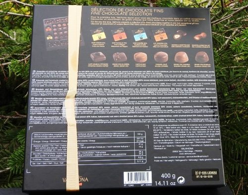Assortiment de chocolats fins, amandes et noisettes enrobées de chocolat au lait (40% de cacao mini, pur beurre de cacao) ou de chocolat noir (55% de cacao mini, pur beurre de cacao, bonbons de chocolat, carrés de chocolat au lait (33% de cacao mini, pur beurre de cacao) et carrés de chocolat noir (64 % de cacao mini, pur beurre de cacao.